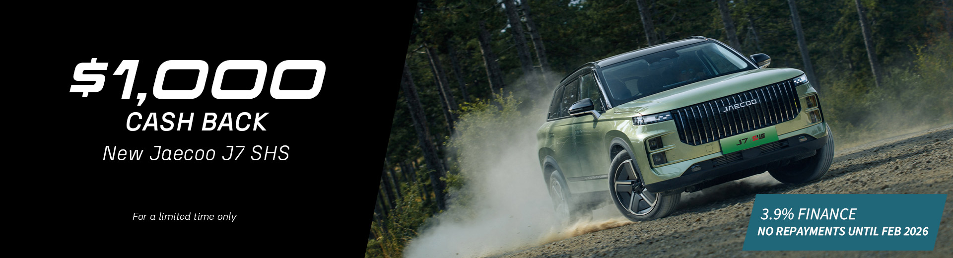 *Terms and Conditions: Purchase any new Omoda Jaecoo model and receive a $1,000 incl. GST ‘Cash Back’ discount off the MSRP, when you purchase between November 1st and November 30th 2025. Cash Back is applied as a discount to the vehicle MSRP at time of purchase and is not redeemable for cash. 3 months deferred repayments offer is based on a 10% deposit and an interest rate of 3.9% p.a. is fixed for the 36-month term of the loan and is available on all new Omoda Jaecoo Models from 1st of November 2025 to 30th November 2025. If you defer your payments up to 3 months, interest will still accrue during the deferral period and will be added to and form part of the loan, together with applicable fees. Payments will begin on the date falling 3 months after the first schedule repayment date. You must repay the full amount of the loan, and your repayments will be spread over the remaining loan term. This offer is not available in conjunction with any other finance offer. The loan term cannot exceed 36 months, and structured payments are not available on this offer. A PPSR fee of $10.35, a monthly maintenance fee of $2, a UDC loan fee of $130, a dealer origination fee of $395 will apply. The loan is provided by UDC Finance Limited. UDC’s lending criteria and standard terms and conditions apply. Not available in conjunction with any other offer. Offer ends November 30th 2025 or while stocks last. Chery Motor New Zealand Limited reserves the right to remove or adjust this offer at any time.