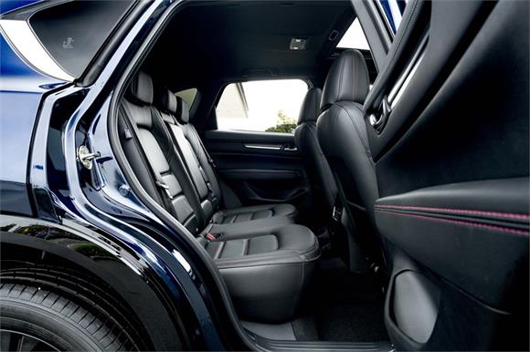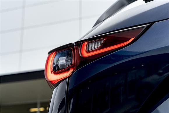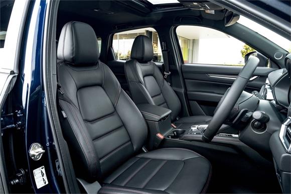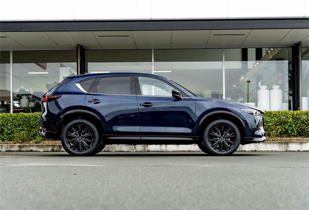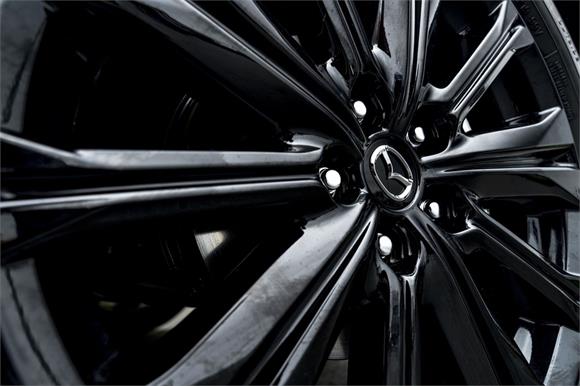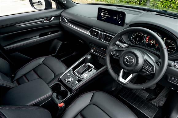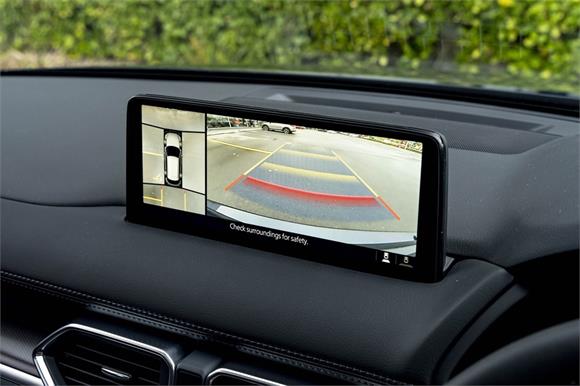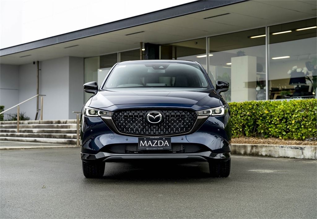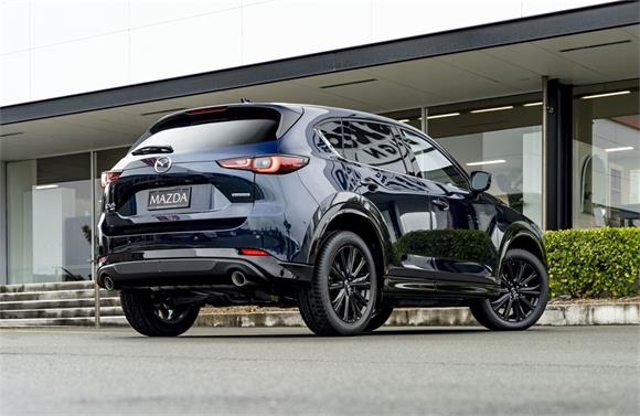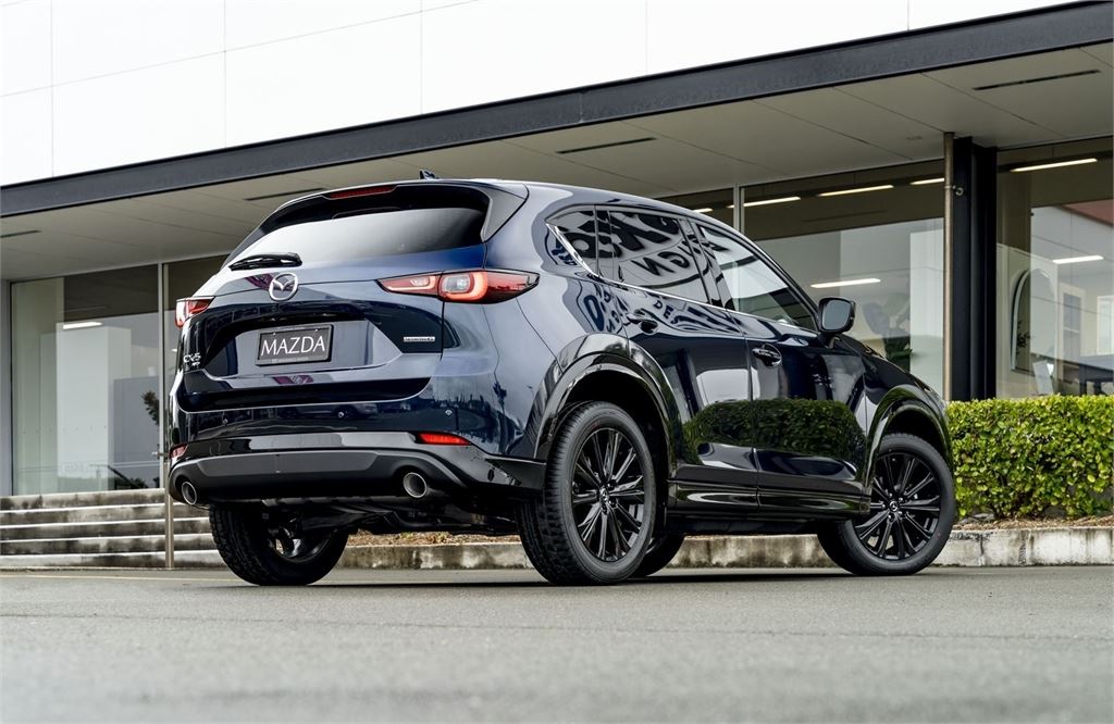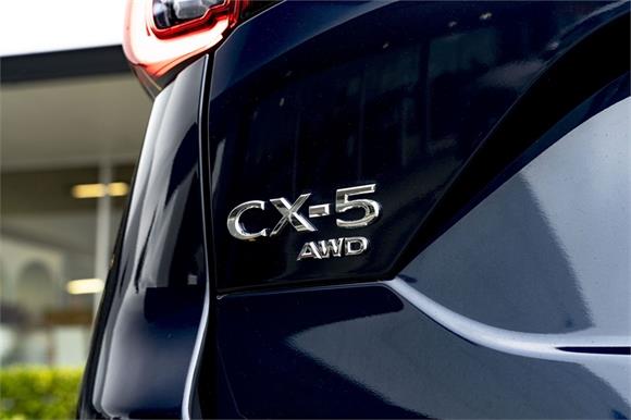 The latest CX-5M Limited grade now offers a 360 Degree Camera and a distinct "Blackout" design aesthetic inside and out. It's outfitted with a revised front grille and paired with a set of 19" black metallic alloy wheels. Punctuating this striking look is a new black leather interior with red stitching.