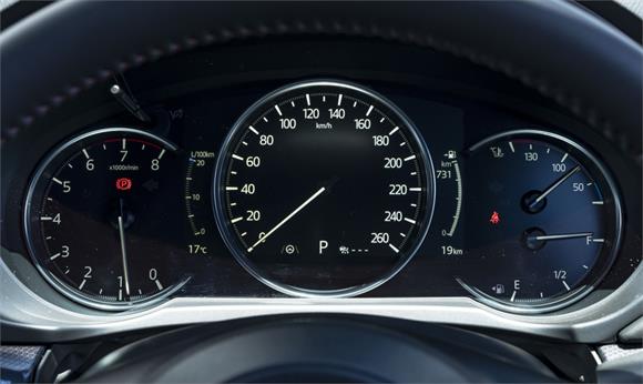 The latest CX-5 M Limited grade now offers a 360 Degree Camera and a distinct "Blackout" design aesthetic inside and out. It's outfitted with a revised front grille and paired with a set of 19" black metallic alloy wheels. Punctuating this striking look is a new black leather interior with red stitching.