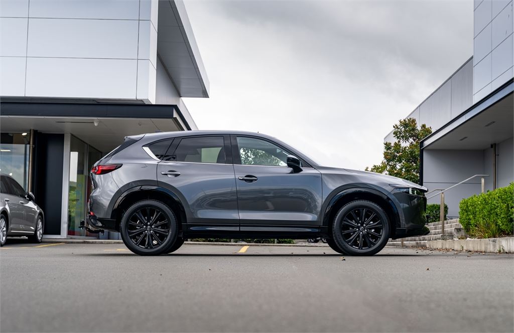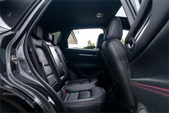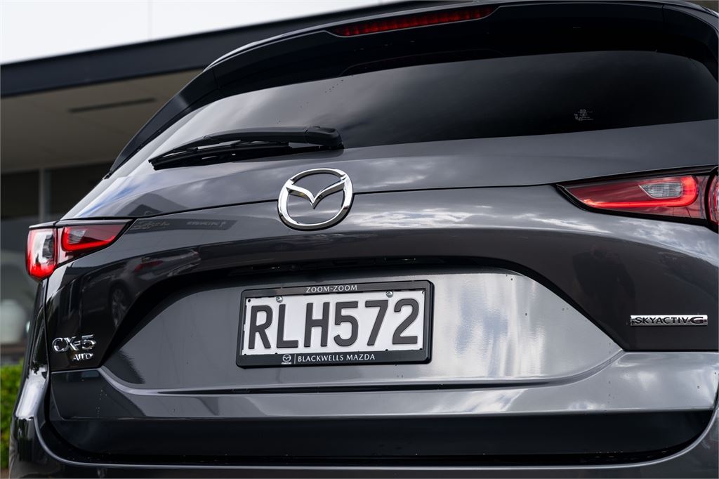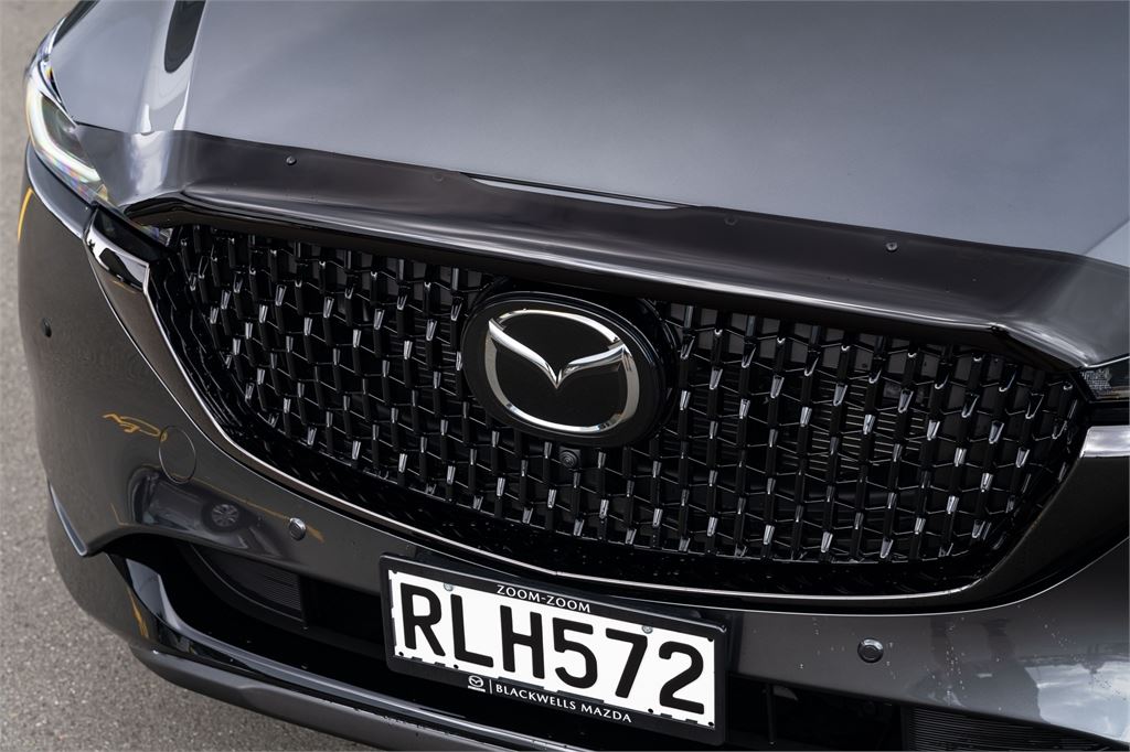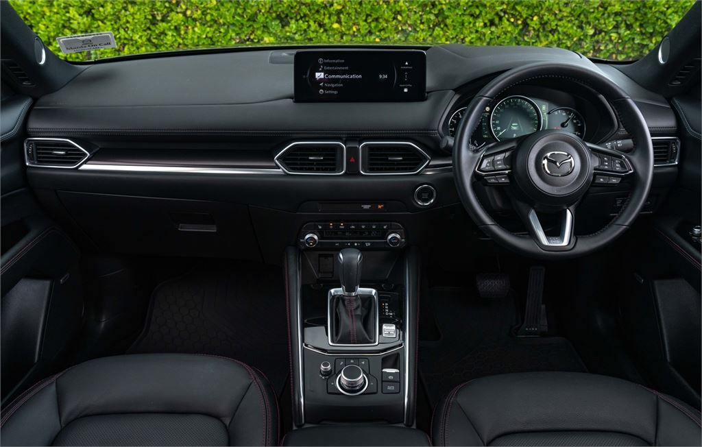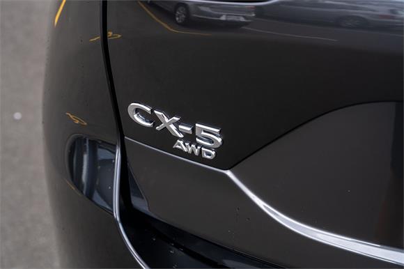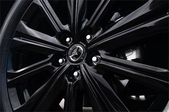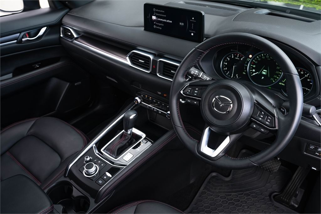 The latest CX-5 M Limited grade now offers a 360 Degree Camera and a distinct "Blackout" design aesthetic inside and out. It's outfitted with a revised front grille and paired with a set of 19" black metallic alloy wheels. Punctuating this striking look is a new black leather interior with red stitching.