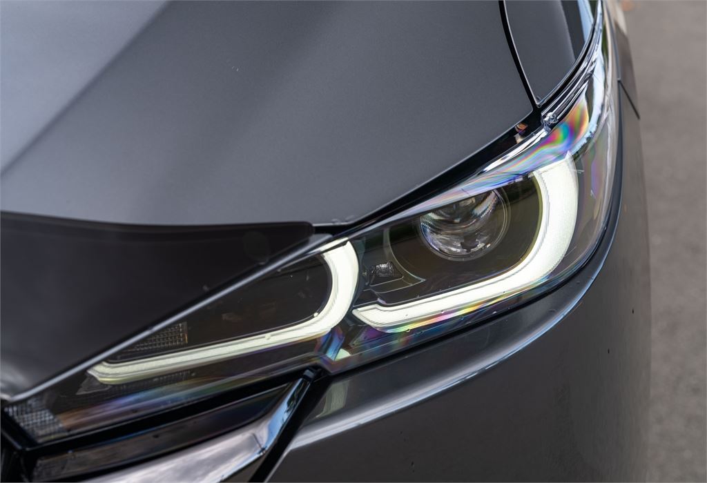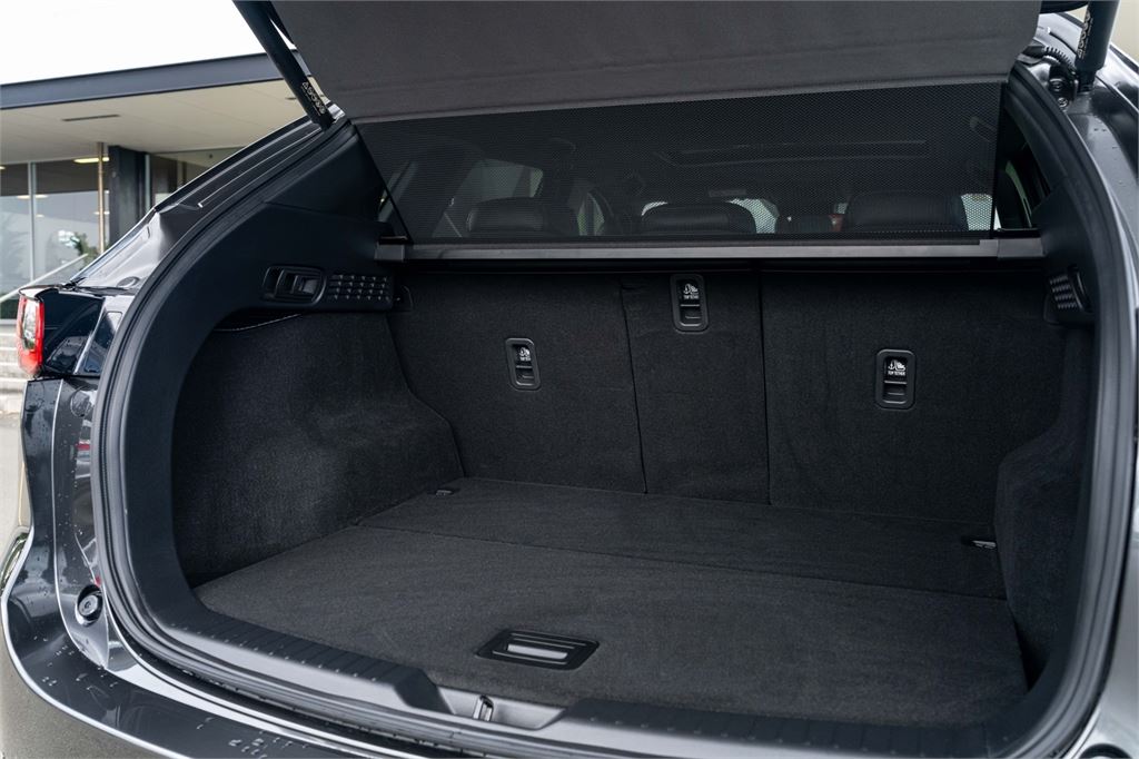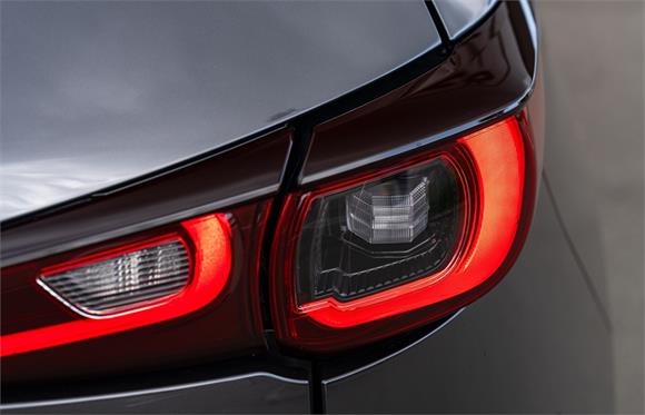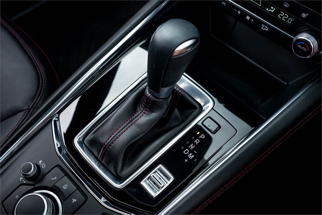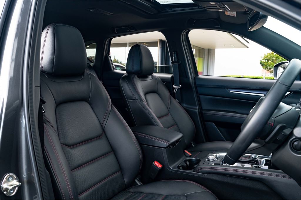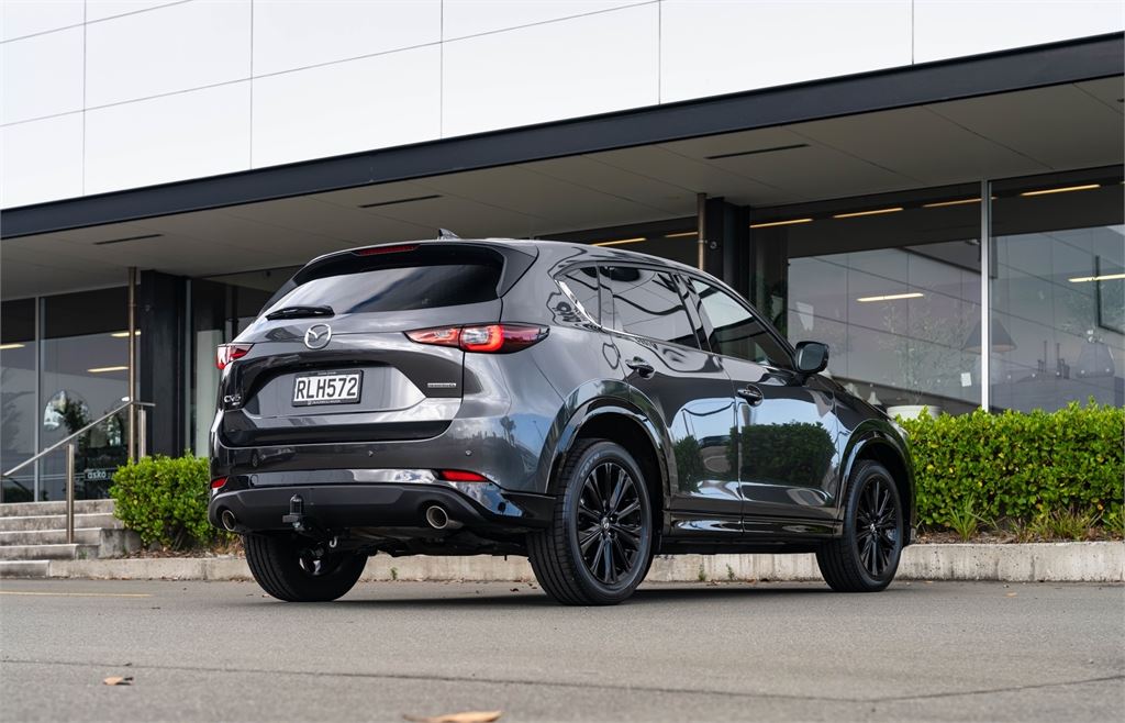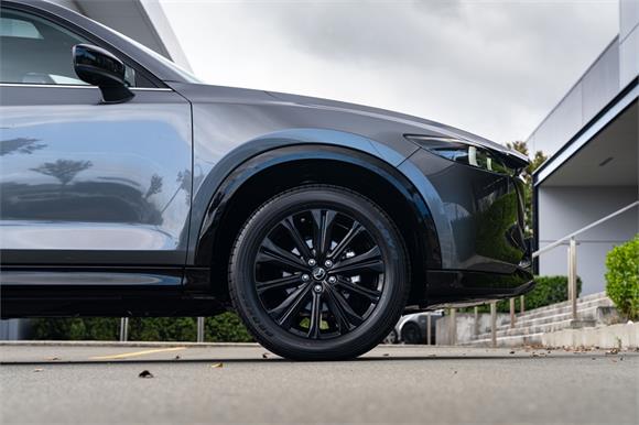The latest CX-5 M Limited grade now offers a 360 Degree Camera and a distinct "Blackout" design aesthetic inside and out. It's outfitted with a revised front grille and paired with a set of 19" black metallic alloy wheels. Punctuating this striking look is a new black leather interior with red stitching.