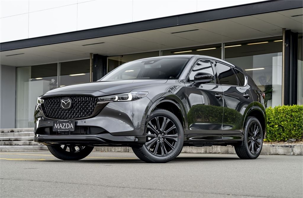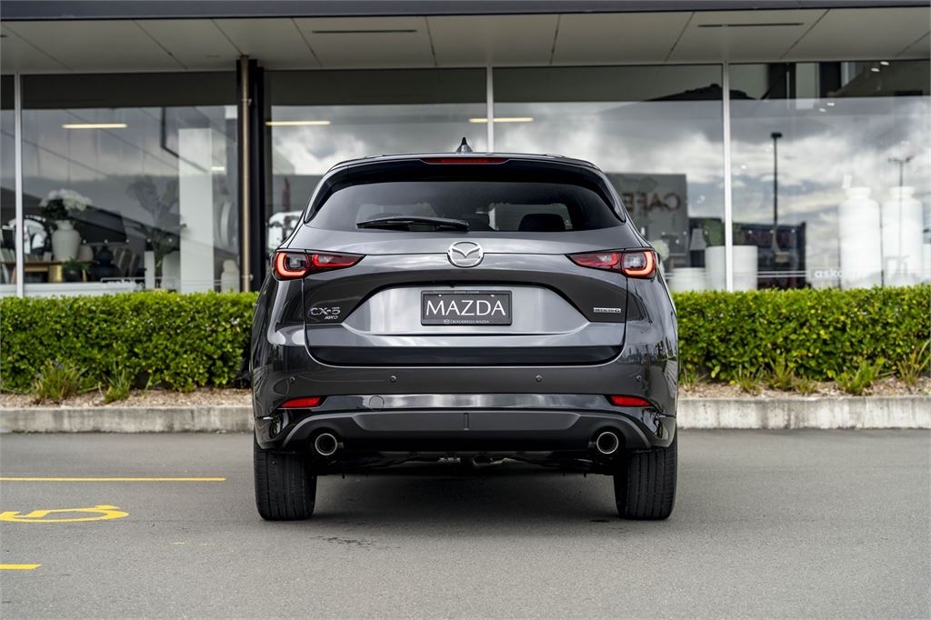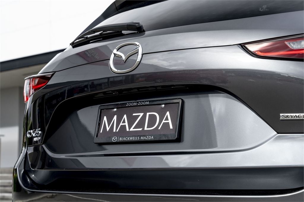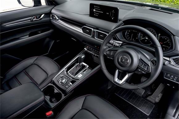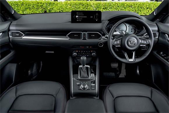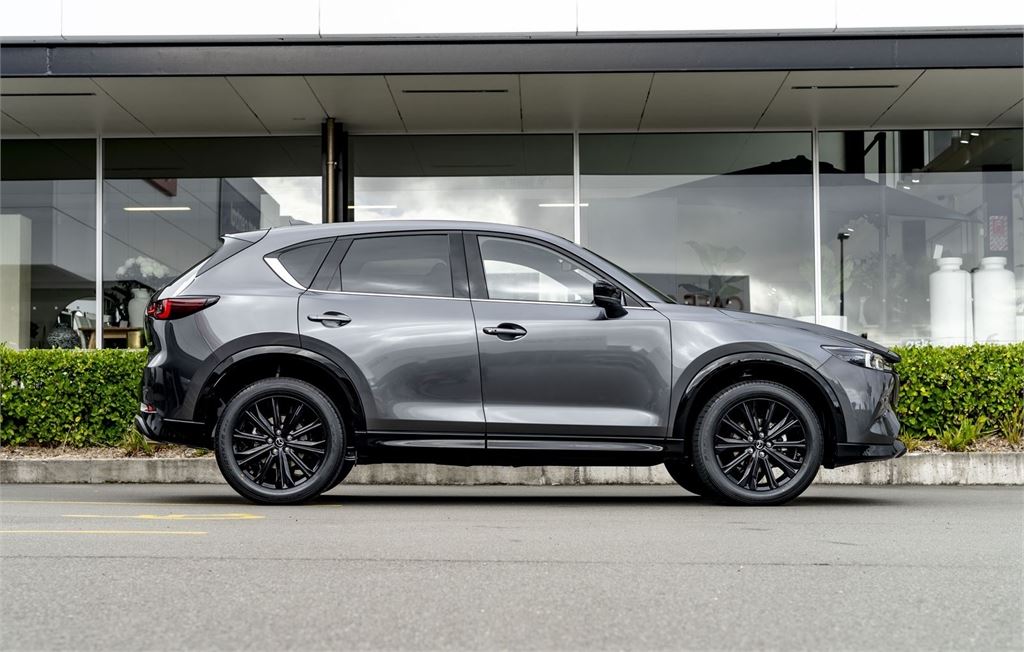 The latest CX-5M Limited grade now offers a 360 Degree Camera and a distinct "Blackout" design aesthetic inside and out. It's outfitted with a revised front grille and paired with a set of 19" black metallic alloy wheels. Punctuating this striking look is a new black leather interior with red stitching.