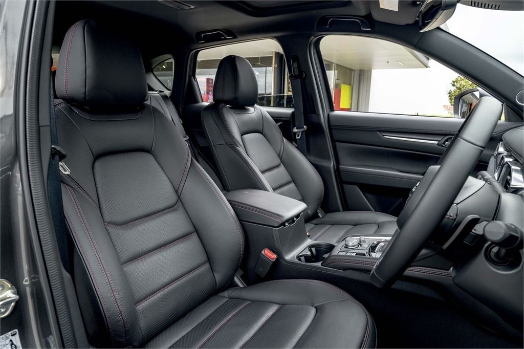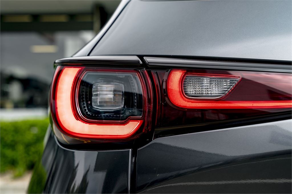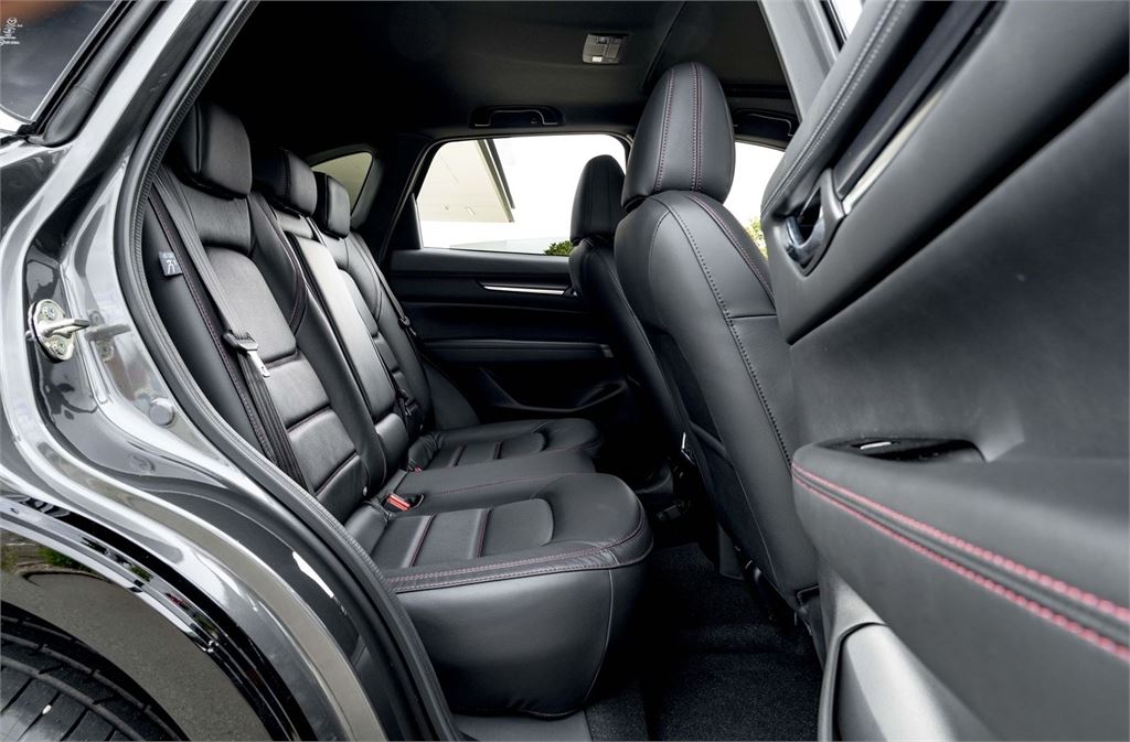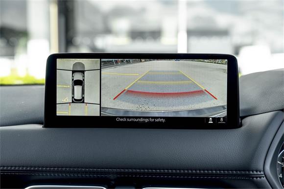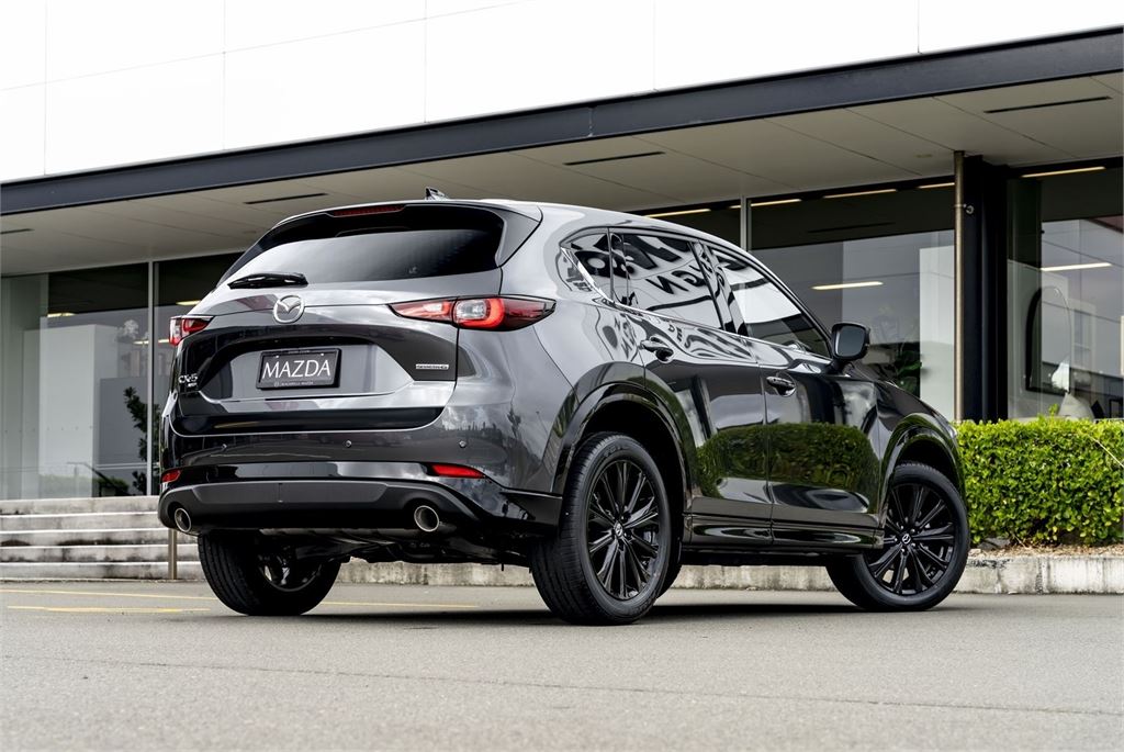 The latest CX-5M Limited grade now offers a 360 Degree Camera and a distinct "Blackout" design aesthetic inside and out. It's outfitted with a revised front grille and paired with a set of 19" black metallic alloy wheels. Punctuating this striking look is a new black leather interior with red stitching.