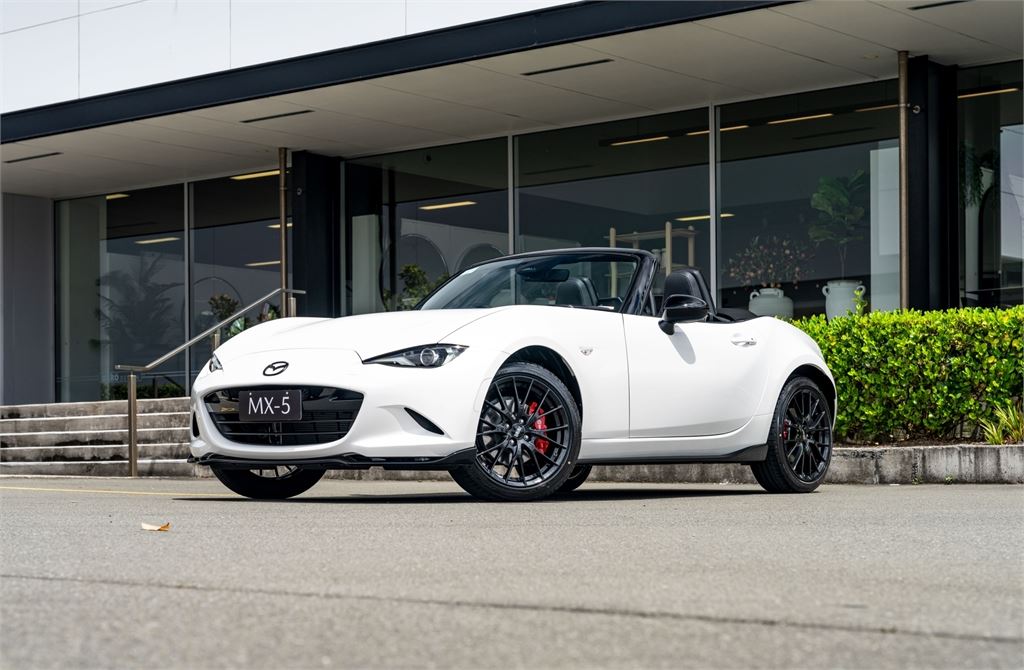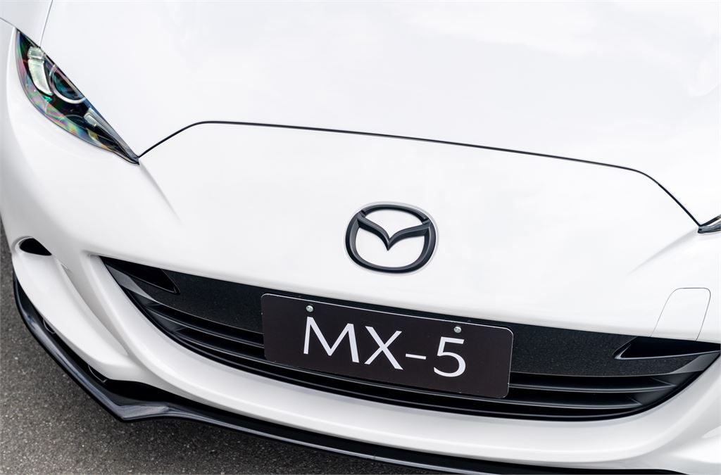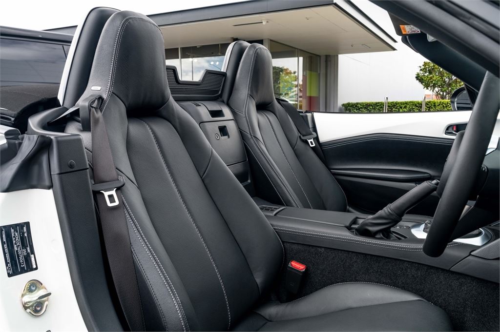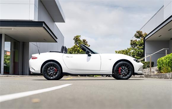 This Brand new MX-5 GT Roadster is finished in Snowflake white metallic and has been enhanced with full Black Edition Package including a Kuroi Sports Kit